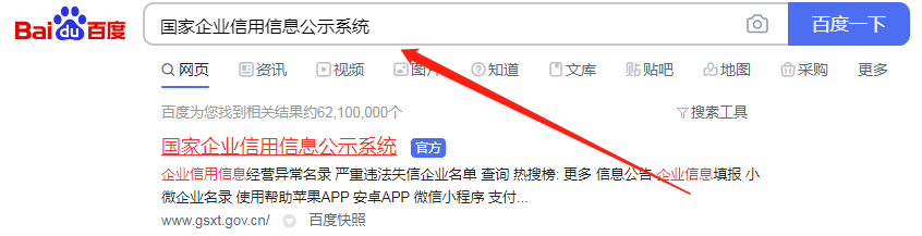 步驟1:在瀏覽器中搜索“國家企業信用信息公示系統”,點擊進入。(也可以從上方查詢入口進入查詢)